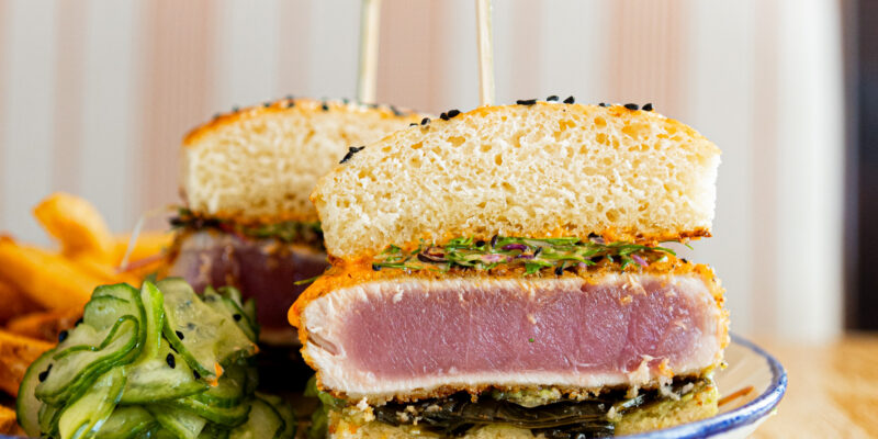 Yellowfin Tuna Katsu Burger Panko-togarashi crusted tuna burger, coconut avocado mousse, yuzu kosho mayo, and pickled mustard greens, served on a Japanese style milk bun.